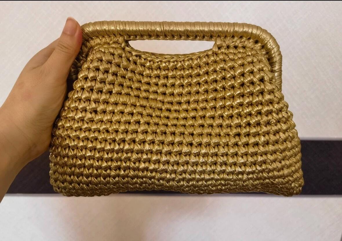 Handmade Mini Crochet Clutch – Gold Metallic Evening Bag | Aunty Woven